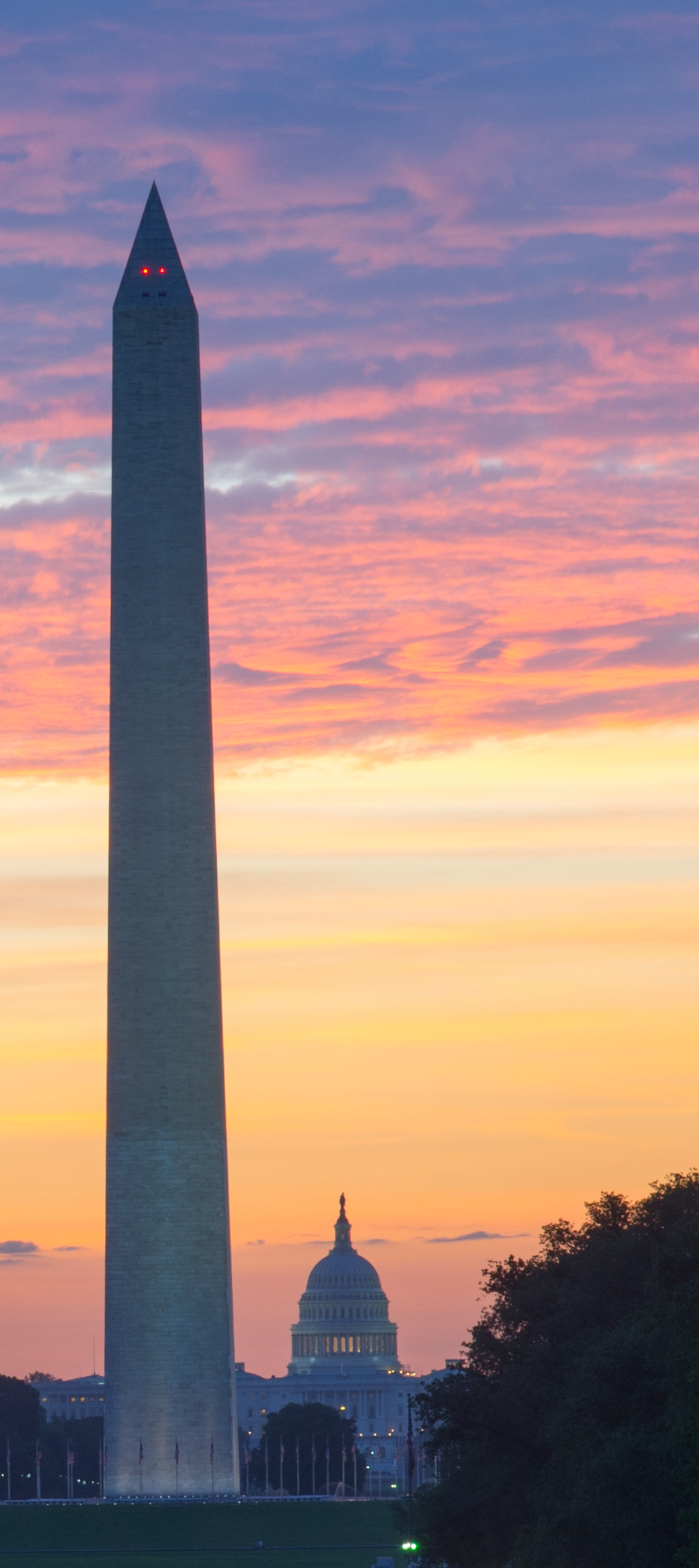 Sunrise of the Washington Memorial and Capital Building.